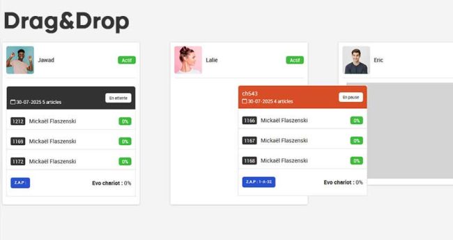 Changez de préparateur par simple glisser-déposer. Le chariot est transféré instantanément, les statistiques sont conservées, et les responsabilités clairement séparées. Idéal pour réorganiser les équipes à la volée.