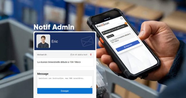 Envoyez des instructions en temps réel à vos préparateurs. Ils reçoivent les notifications directement sur leurs appareils et peuvent y répondre sans interrompre leur session de picking.