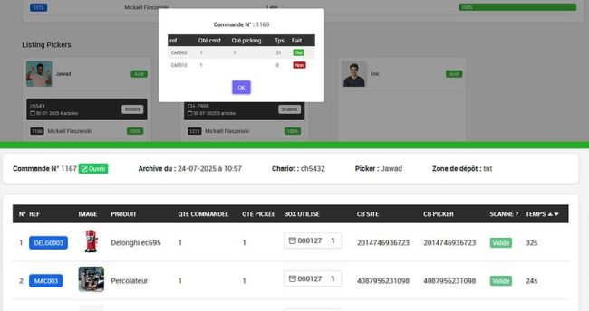 En un clic, accédez aux détails : produits scannés, quantités, temps de préparation, statuts.